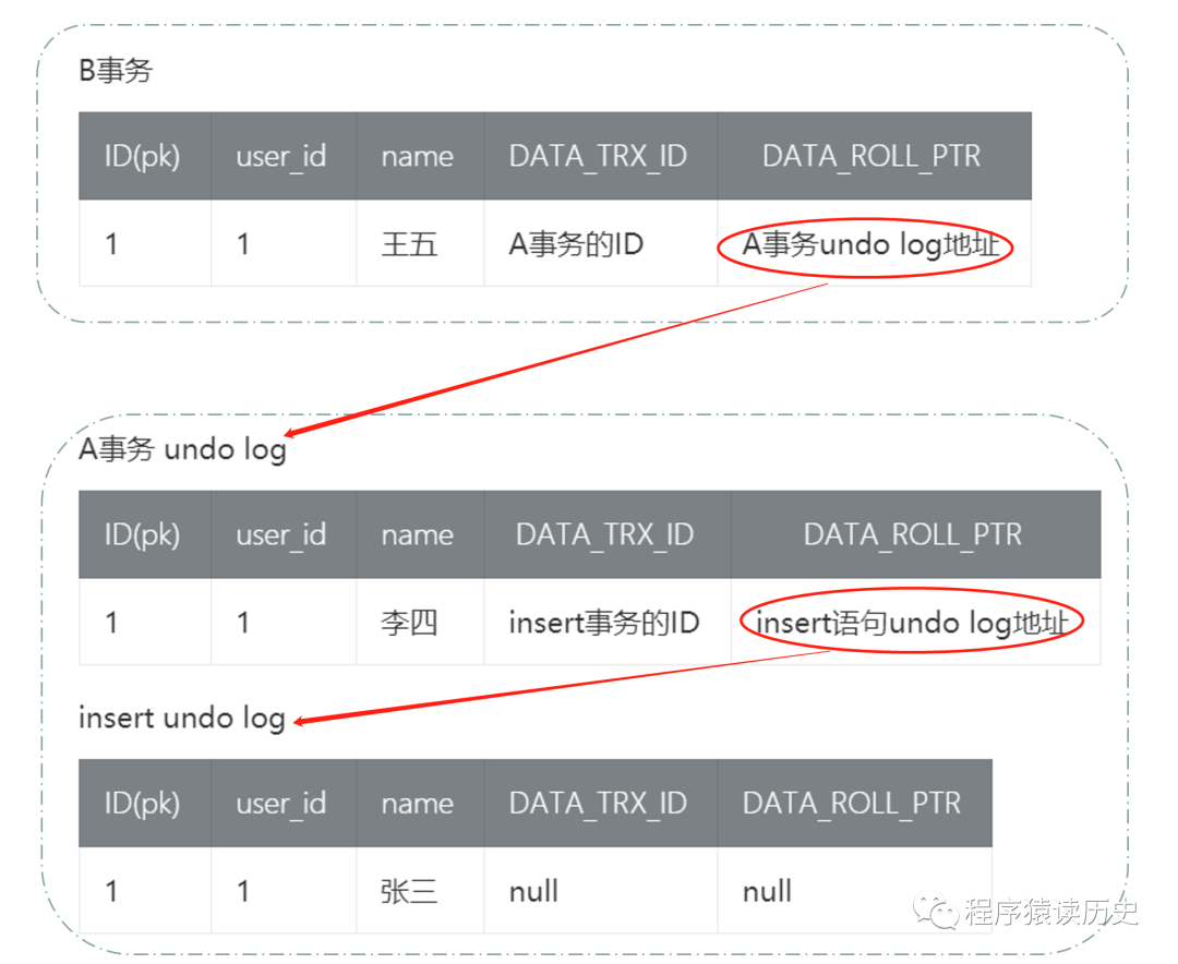 c、在将【李四】改为【改为】,同时在DATA_TRX_ID列记录当前B事务的ID,并且DATA_ROLL_PTR列则指向上一步的undo log地址。