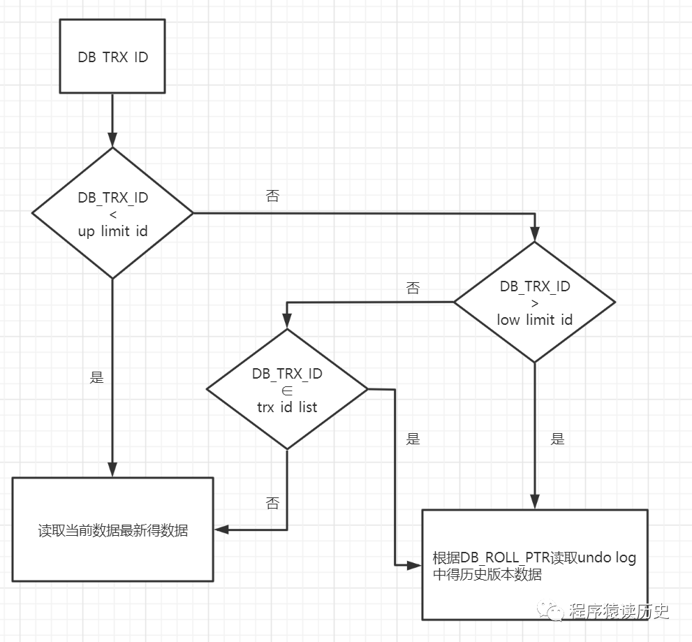 根据上面描述一句话总结,当这个事务的ID小于read view中最小的事务ID,或者这个事务的ID值在read view范围内又不在这个列表中,则可以读取最新数据,其他情况读取的都是历史版本数据