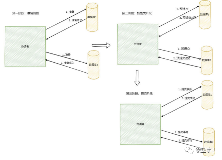 如流程图所示3PC有三个阶段,分别是CanCommit、PreCommit、DoCommit。该算法不会上来就直接操作资源,而是有一个询问的操作,从而防止某些资源不可用时所有参与者都阻塞。