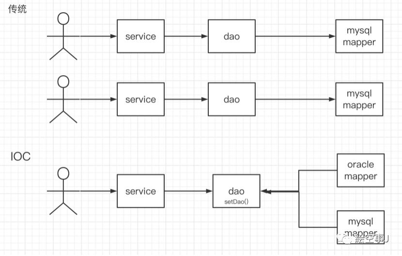 IoC模式:将dao的创建交个第三方容器,通过setter/构造器/接口方式将mapper注入进对象。相当于将创建对象的职能控制反转给用户,用户需要什么实现方式就用什么方式实现。
