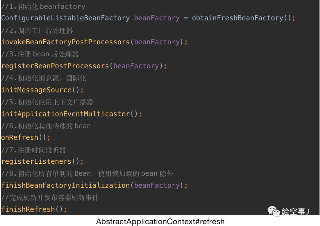 Spring的AbstractApplicationContext是ApplicationContext的抽象实现,该抽象类的refresh()方法定义了Spring容器在加载配置文件后的处理过程。