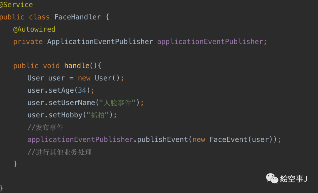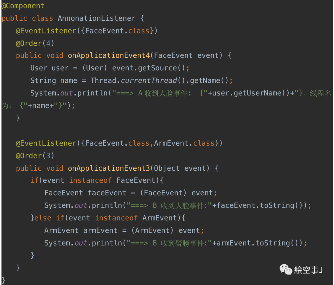 应用实例:如下面代码,当一个user进入代码时,同时被两个listerner观察。