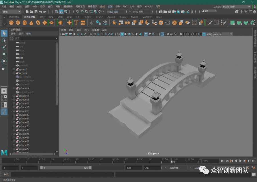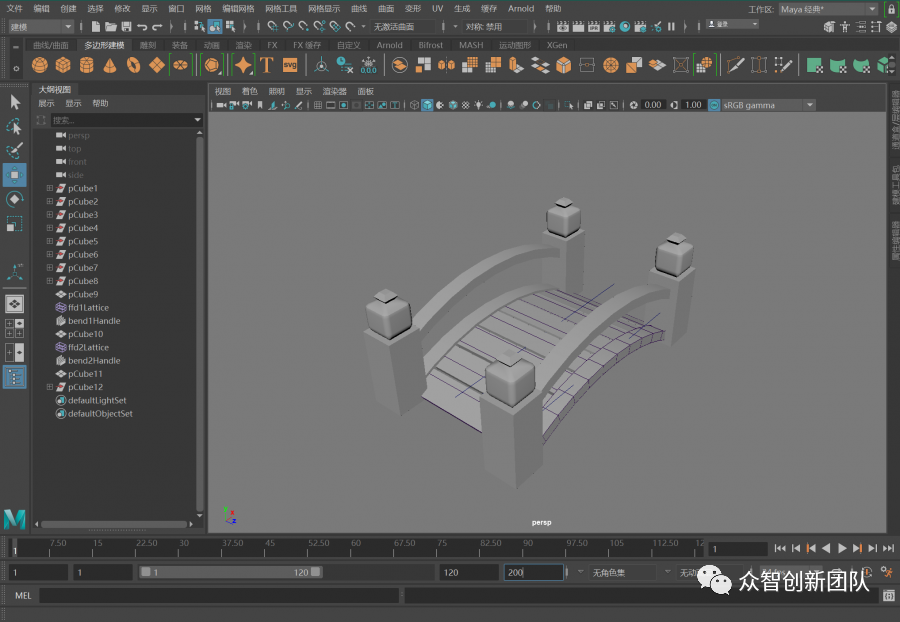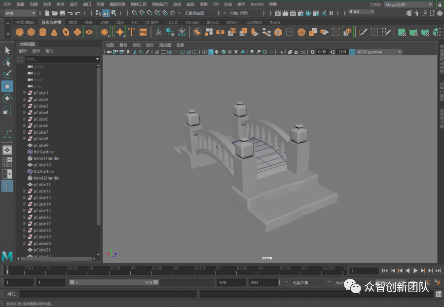 *下面做桥边的立柱。创建立方体,ctrl+R拉伸成长方体。