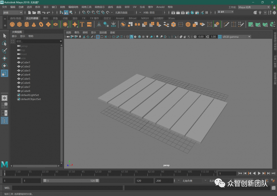 * 选择一个几何体,ctrl+R进行压缩、拉长,一根木板完成。