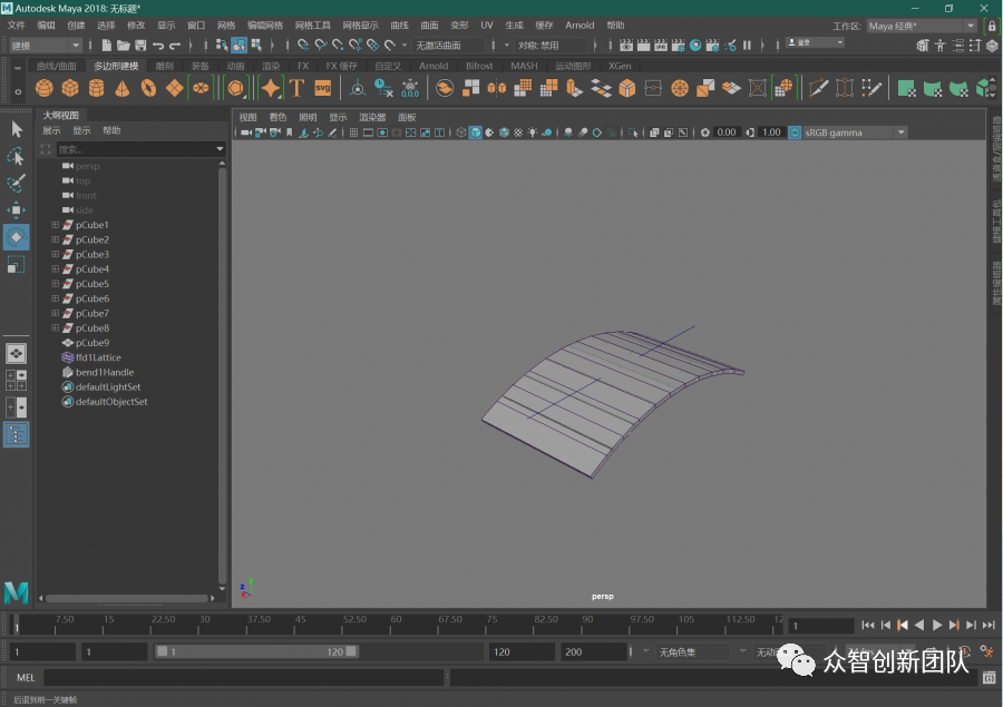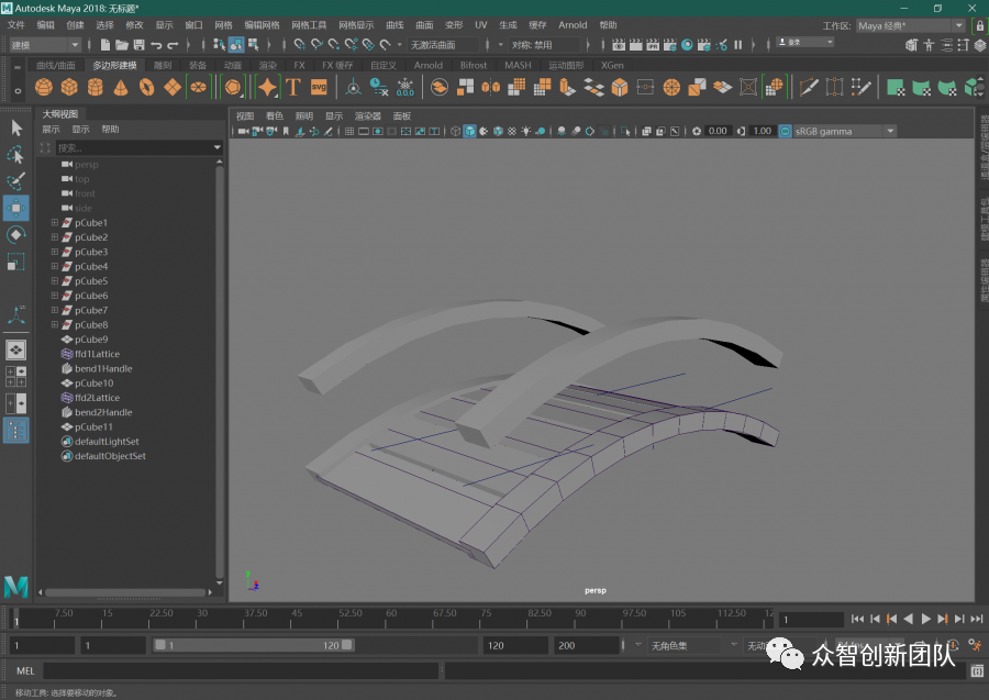 大家可以看到,它是在“建模”模式下工作,大纲视图显示的是它的所有组件。