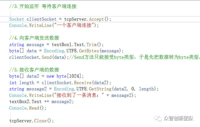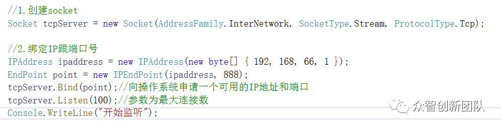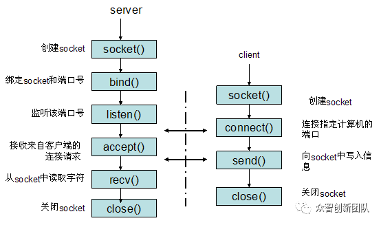 作为服务器是不可以主动和客户端建立联系的,只能等待服务器的连接。所以我们先用Socker定义TCP/IP协议,并用bing方法绑定固定的ip和端口号。然后用listen方法定义最大连接数量。Listen方法用来监听Socket,如果客户端这时调用connect()发出连接请求,服务器就会接收到这个请求。TCP服务器监听到这个请求之后,就会调用accept()函数接收请求,这样连接就建立好了。之后就可以开始接收发送信息了。接收发送信息有read()、write()等函数。关闭时用close方法。