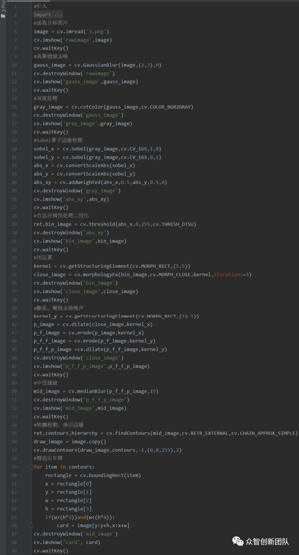 首先,我们需要确定车牌在目标图片的什么位置。通过对目标图片进行滤波、灰度、Sobel算子边缘检测、自适应阈值处理、闭运算、膨胀、腐蚀、轮廓检测等一系列形态学操作。利用车牌的特定长宽比锁定车牌位置并截取出来。