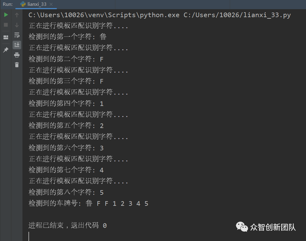 经过上面两步,我们已经获得了单个字符的图片,此时我们利用已经准备好的模板库,与之进行特征值运算比较。与字符图片相似度最高的模板标签即为,模板识别的输出结果。按照相同的方法识别余下字符,并将他们打印出来,这就是整个工程文件所实现的效果,将目标图片车辆的车牌号识别并打印出来。