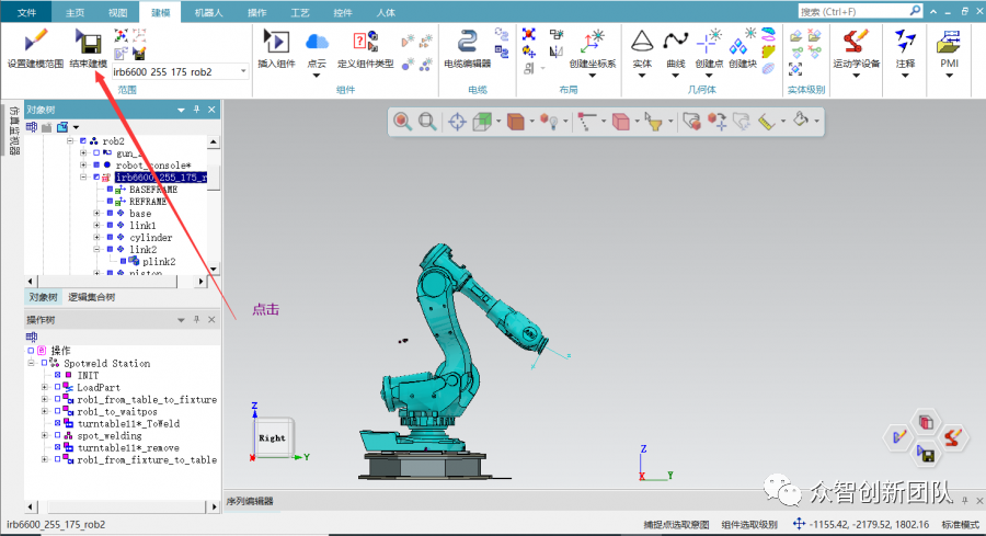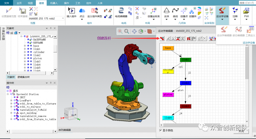 当ABB机器人导入后选择菜单栏建模﹥设置建模范围﹥运动学设备﹥运动学编辑器。
