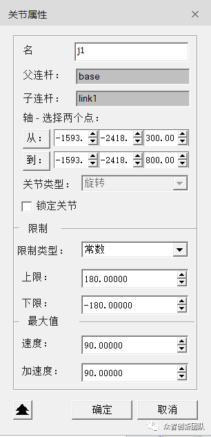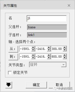 左键按住一个关节(父连杆)与另一关节相连(子连杆)关节类型选择旋转并创建旋转轴即从:(坐标)到:(坐标)。