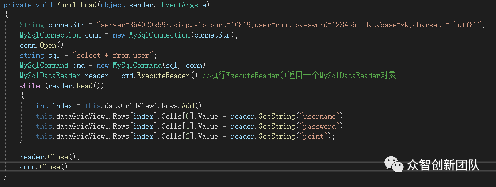 数据库的工作已准备就绪,现在进行后台代码的编写,这个功能的实现原理是读取数据库每一列的数据并将其赋值给dataGridView控件相对应的列上,具体代码如图2.5所示,结果如图2.6所示。