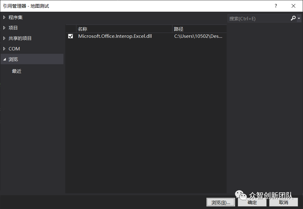 首先,先进行编程环境的配置。这里需要引用一个拓展包Microsoft.Office.Interop.Excel.dll(文末附有下载连接),如图3.1所示。