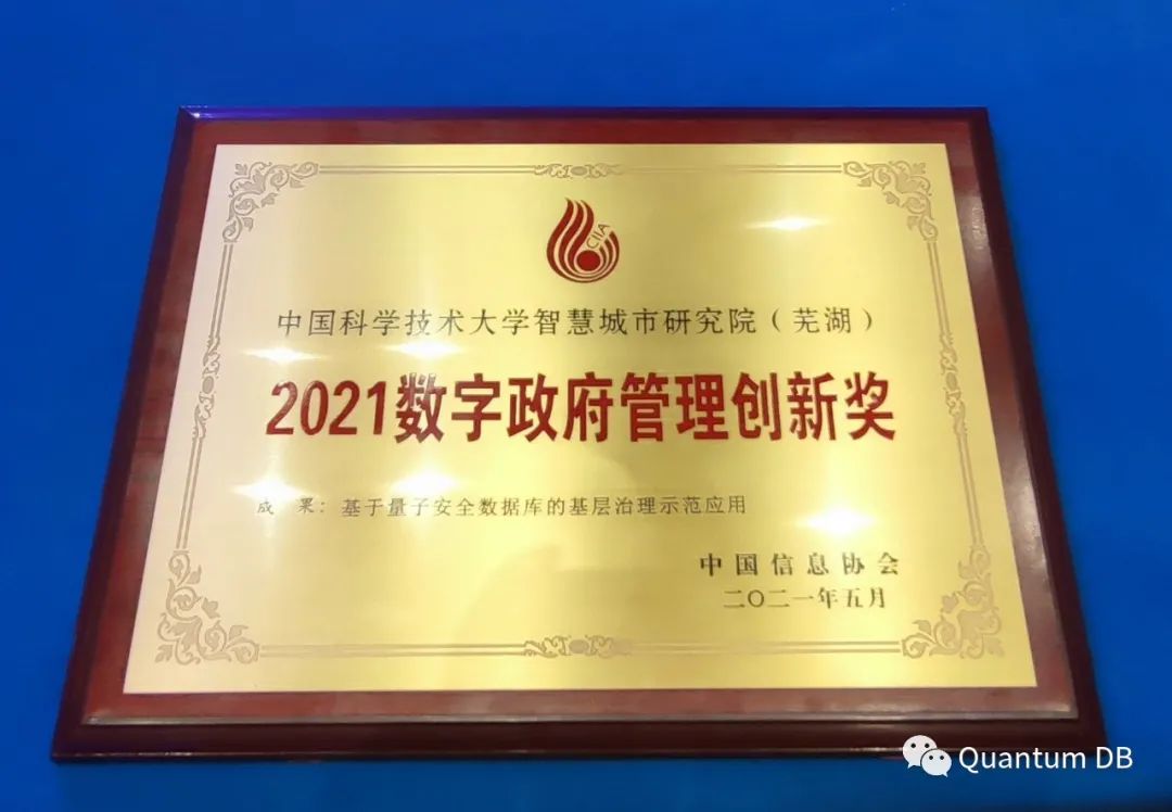 5月25日,在贵州数博会数字政府论坛上,中科大智慧城市研究院(芜湖)与安徽华典大数据有限公司联合研发的“数智通”系统获得“2021数字政府管理创新奖”。该系统是首个基于量子安全数据库的基层治理系统,系统首创将量子安全技术与大数据技术相结合,让基层治理“活起来”,实现基层治理数据规范化、过程可视化、管控智能化,通过量子加密技术的应用,开创基层治理数据安全新模式。
