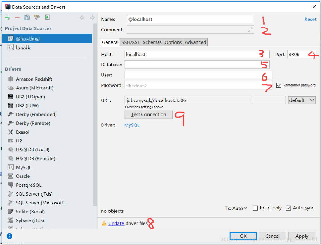 9、填写自己的数据库连接url,然后可以点击9所在按钮进行测试连接,本地连接失败检查是否开启了mysql服务