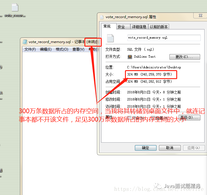 向该表中插入300万条数据后,再转储到桌面,查看转储后的SQL文件的属性: