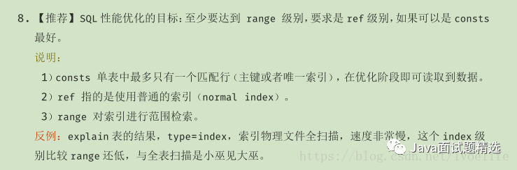 能用索引的尽量使用索引,type至少达到range级别_,这不是我说的,这是阿里巴巴开发手册的5.2.8中要求的_