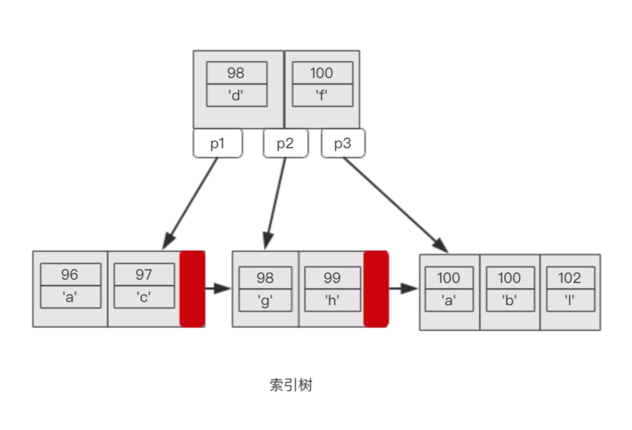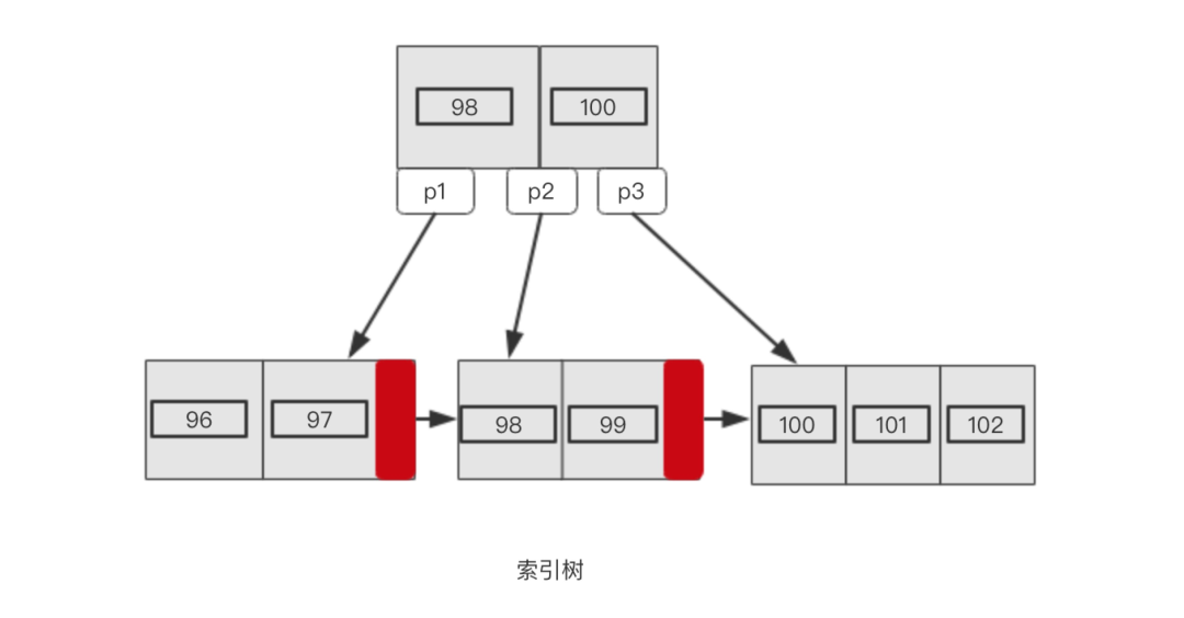 上面User 表给uid列创建了一个索引,那么往表里插入uid(96~102)的时候存储引擎是怎么管理索引的呢?看下面的索引树