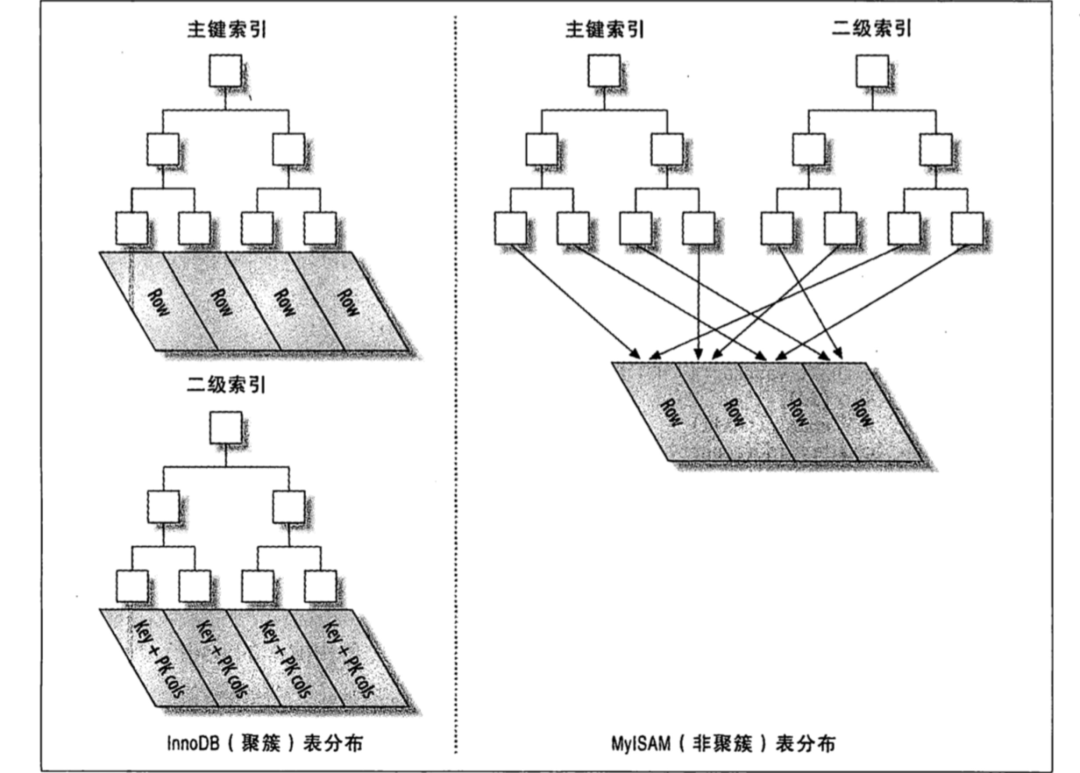 下面看下聚簇索引和非聚簇索引在索引树上数据是怎么分布的,图片摘自《高性能Nysql》