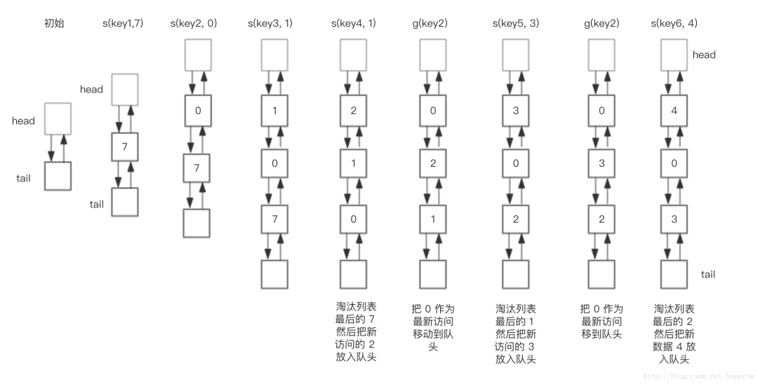 LRU 存储是基于双向链表实现的,下面的图演示了它的原理。其中 h 代表双向链表的表头,t 代表尾部。首先预先设置 LRU 的容量,如果存储满了,可以通过 O(1) 的时间淘汰掉双向链表的尾部,每次新增和访问数据,都可以通过 O(1)的效率把新的节点增加到对头,或者把已经存在的节点移动到队头。