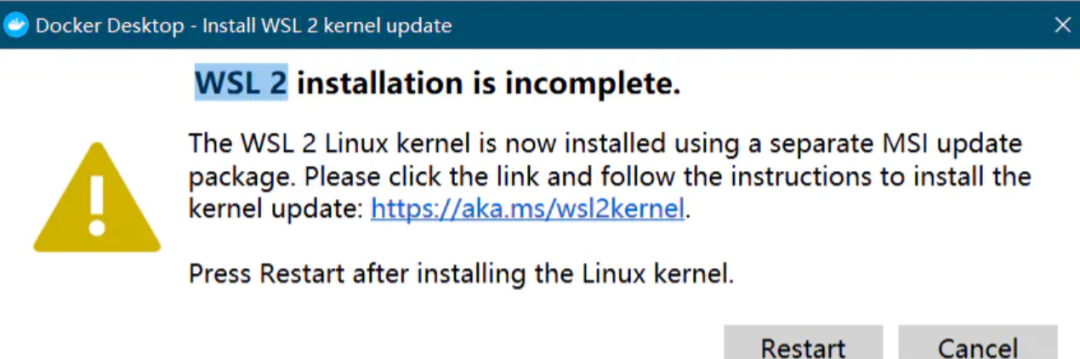 重启之后又跳出一个框提醒我升级WSL2内核,点击其中的链接下载wsl_update_x64.msi,双击安装。再重启。Docker就自动运行起来了(默认是开机自启动的)。