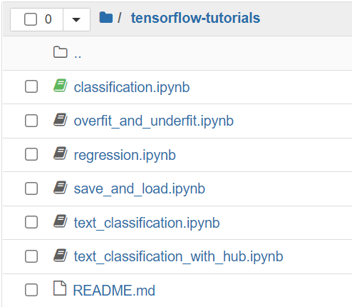 运行起来后命令行里可以看到一个http://127.0.0.1:8888/开头的url,复制该url在浏览器中打开,进入tensorflow-tutorials文件夹即可看到下面的内容。