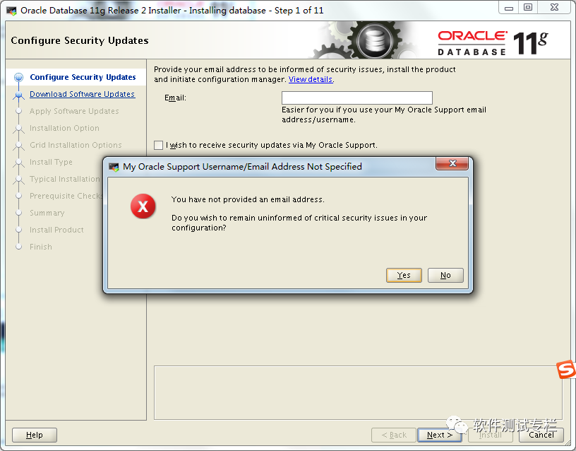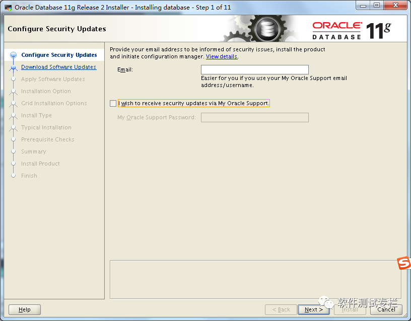 取消:“我希望通过My Oracle Support接收安全更新”前面的勾,不接收更新,点Next