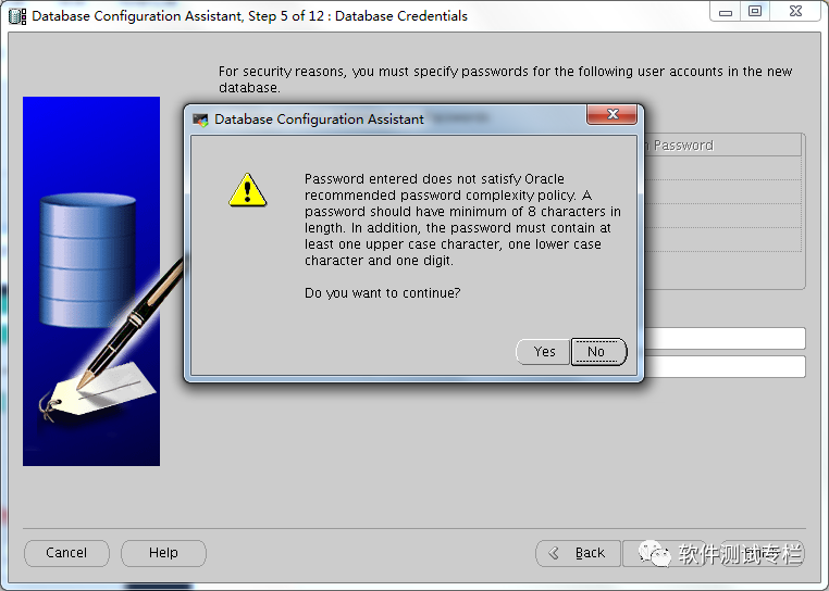 如果口令设置的太简单,不满足Oracle口令的复杂性要求,会弹出下面的界面,可以选择是或者选择否,然后返回口令设置,重新设置一个复杂的口令