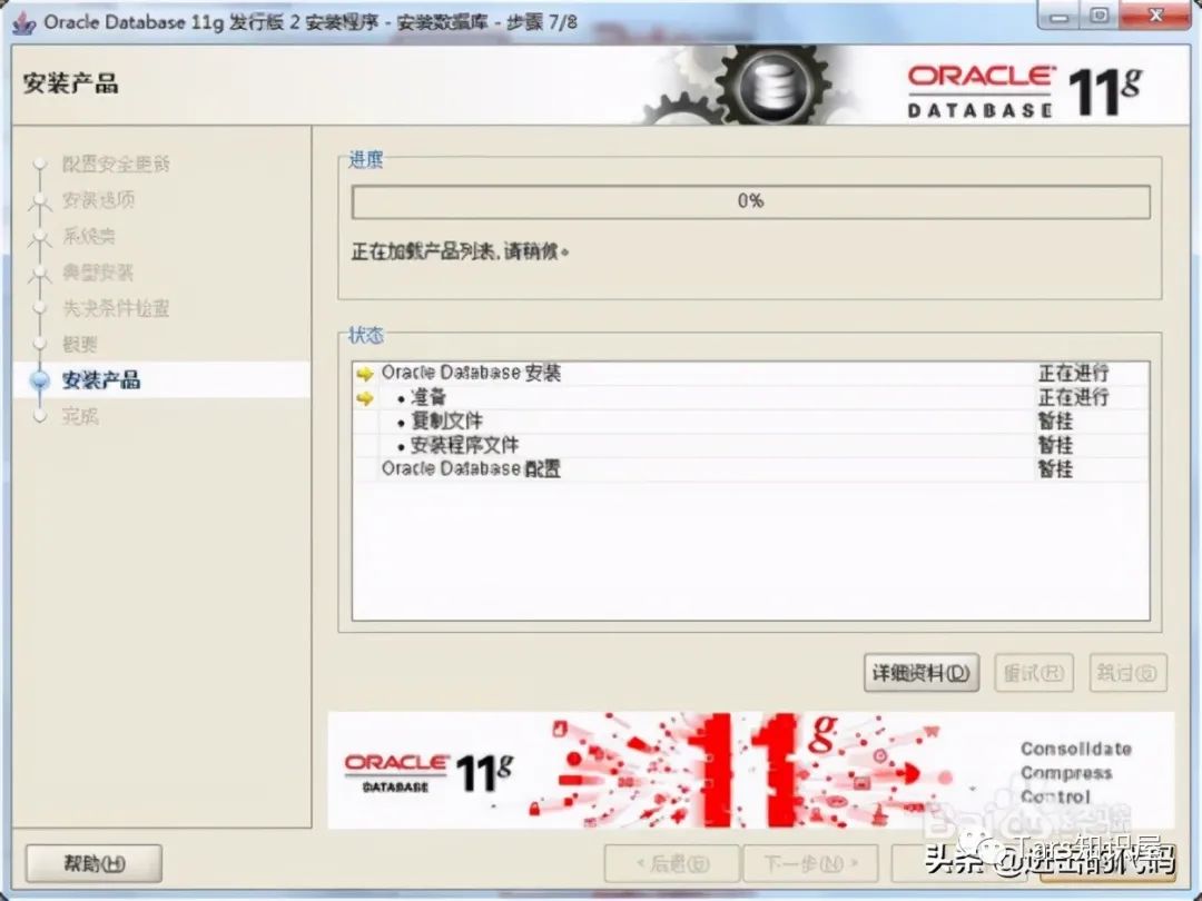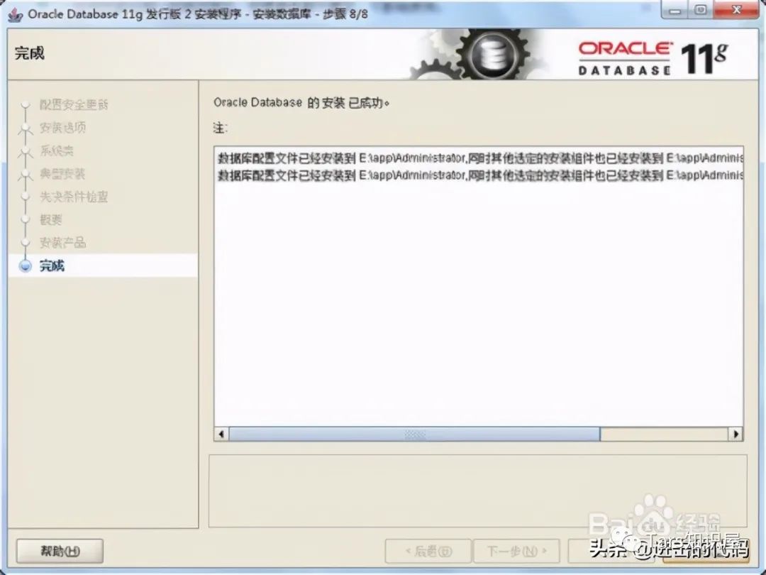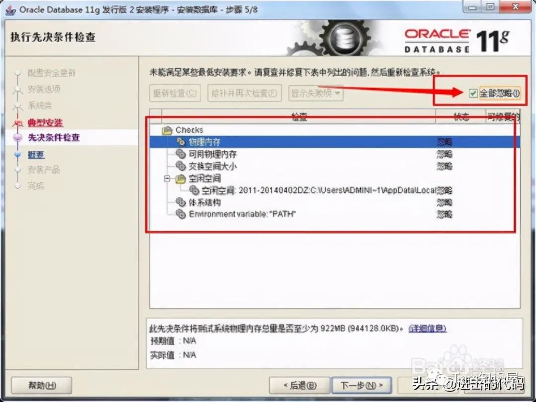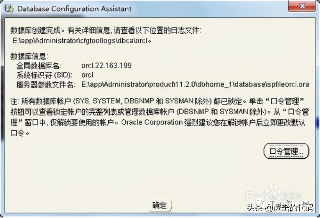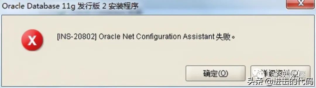 安装过程中出现下图所示对话框,显示:“[INS-20802] Oracle Net Configuration Assistant 失败。”,可以直接忽略之,继续安装 出现口令管理界面,表明基本成功安装。
