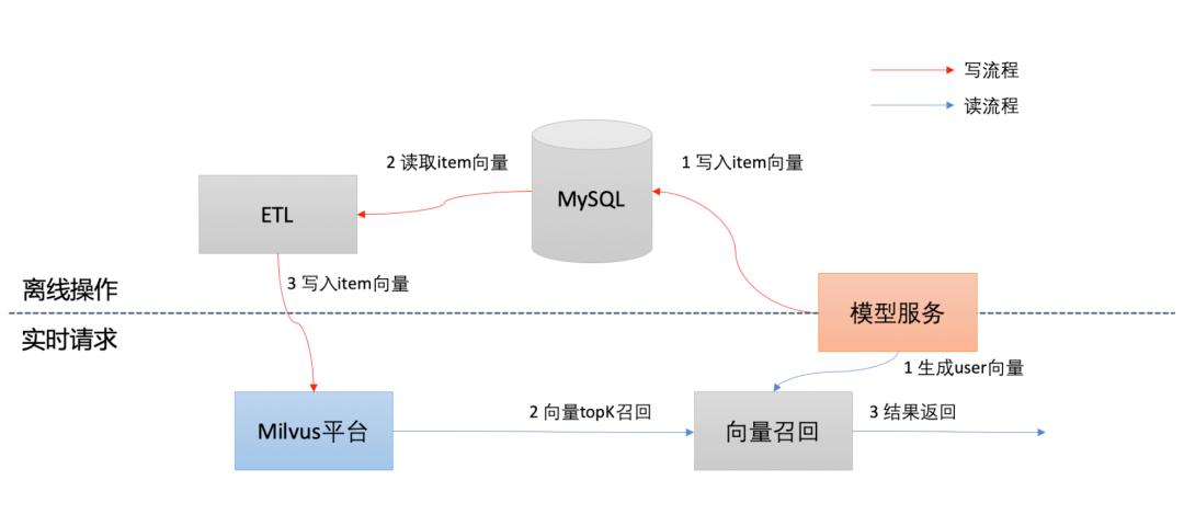 写入流程:将深度学习模型产生的 item 向量归一化后写入到 MySQL 中,数据同步工具(ETL)读取 MySQL 中的 item 向量并导入向量数据库 Milvus。 读取流程:搜索服务根据用户查询关键词和用户画像获取 user 向量,在 Milvus 中查询相似向量并召回 TopK 个 item 向量。
