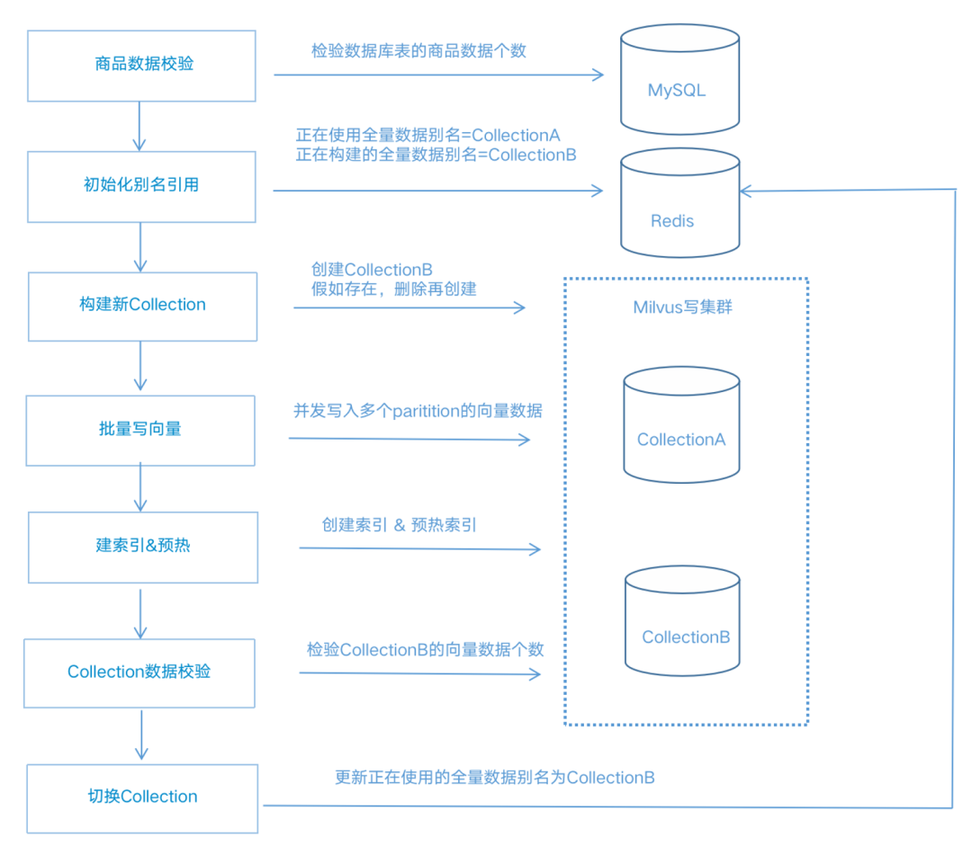 由于 Milvus 目前暂不支持 collection 的别名切换,我们通过引入 Redis 在多个全量数据 collection 之间实现别名的无缝切换。