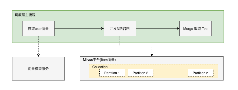 根据用户查询关键词和用户画像获取 user 向量,多次调用 Milvus partition 的数据并计算 user 向量和 item 向量的相似度,汇总后返回 TopK 个 item 向量。整体示意图如下: