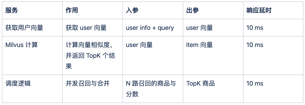 下表列出了这一流程涉及到的几个主要服务。可以看出,召回 TopK 个向量的平均延时约 30 ms。