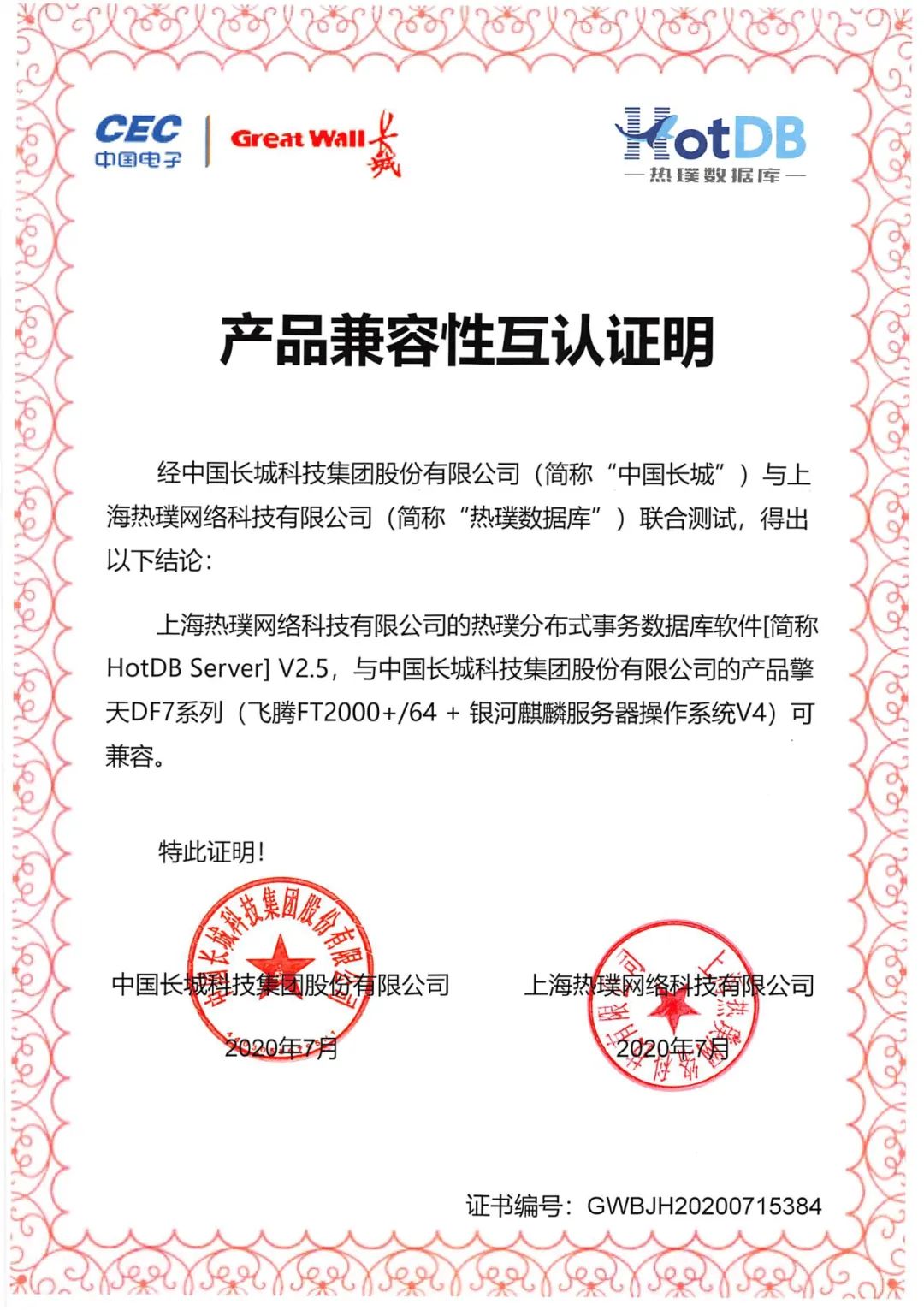 值得一提的是,2020年7月,上海热璞网络科技有限公司(简称“热璞数据库”)的分布式事务数据库产品HotDB Server V2.5与中国长城科技集团股份有限公司(简称“中国长城”)的产品擎天DF7系列飞腾FT2000+/64+银河麒麟服务器操作系统V4),历时数月,经过严格测试,各项性能均以高分通过,成绩表现优异,获双方官宣兼容性认证成功,并发布互认证书。
