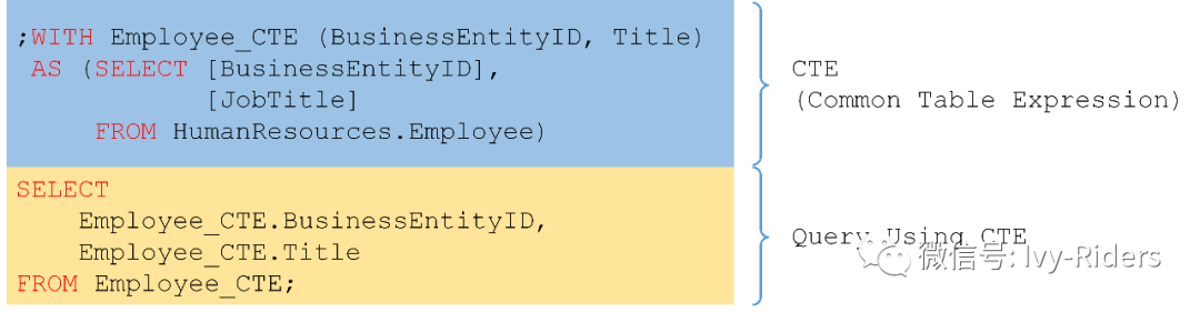 -------------- Type One: Non-Recursive Single CTE---------USE AdventureWorks2019;GO;WITH Employee_CTE (BusinessEntityID, Title)AS (SELECT [BusinessEntityID],[JobTitle]FROM HumanResources.Employee)SELECT Employee_CTE.BusinessEntityID,Employee_CTE.TitleFROM Employee_CTE;