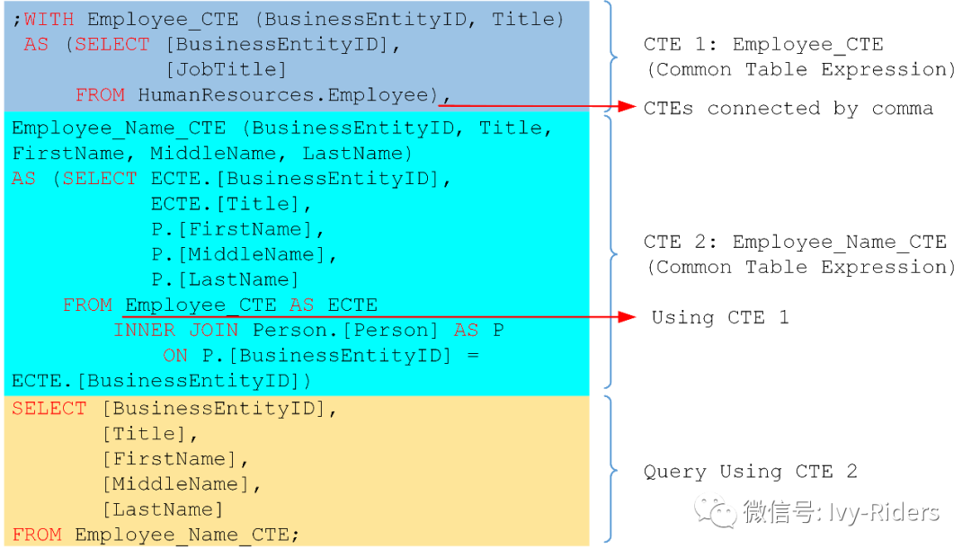 -------------- Type One: Non-Recursive Multiple CTE-------;WITH Employee_CTE (BusinessEntityID, Title)AS (SELECT [BusinessEntityID],[JobTitle]FROM HumanResources.[Employee]),Employee_Name_CTE (BusinessEntityID, Title, FirstName, MiddleName, LastName)AS (SELECT ECTE.[BusinessEntityID],ECTE.[Title],P.[FirstName],P.[MiddleName],P.[LastName]FROM Employee_CTE AS ECTEINNER JOIN Person.[Person] AS PON P.[BusinessEntityID] = ECTE.[BusinessEntityID])SELECT [BusinessEntityID],[Title],[FirstName],[MiddleName],[LastName]FROM Employee_Name_CTE;