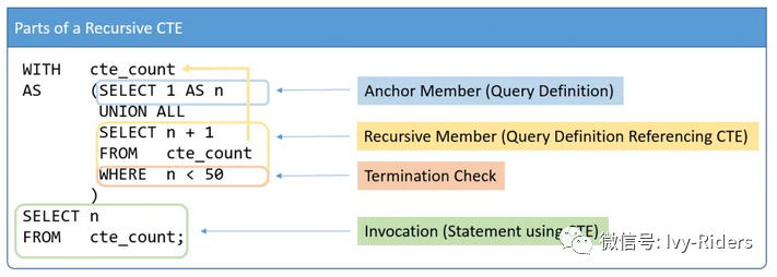 Step 1,如下图蓝色部分,定义CTE表达式,如CTE名称,字段,查询语句;