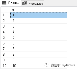 -------------- Type Two: Recursive CTE--------------------DECLARE @Cnt INT = 50; -- 定义整型变量Cnt;WITH CTE_Cnt (n) -- 定义CTEAS (SELECT 1UNION ALLSELECT n + 1FROM CTE_Cnt -- 递归调用CTE本身WHERE n < @Cnt) -- 设置递归结束条件SELECT nFROM CTE_CntOPTION (MAXRECURSION 0); -- 设置最大调用次数,默认100,0代表无限制