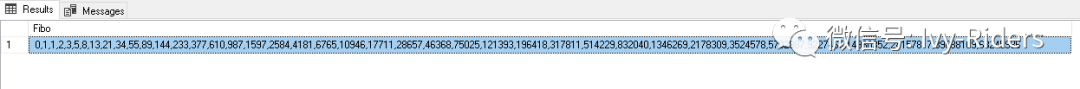 ------ Type Two: Recursive CTE - Fibonacci Sequence------;WITH Fibonacci (PrevN, N) -- 定义CTE名称AS (SELECT 0,1 -- 定义斐波那契数列前两列UNION ALLSELECT N,PrevN + NFROM Fibonacci -- 引用CTE自身WHERE N < 100000000) -- 设置斐波那契数列结束条件SELECT STRING_AGG(PrevN, ',') AS Fibo -- 执行查询语句FROM Fibonacci -- STRING_AGG适用于SQLServer2017之后的版本OPTION (MAXRECURSION 0); -- 设置最大递归次数可选项