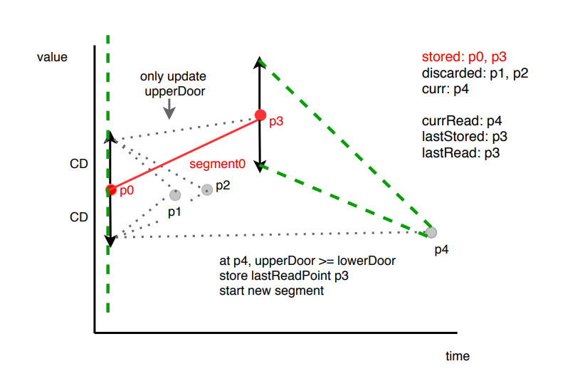 lastStored = p0 当数据为第一个数据或者超过CD时,标记lastStored,并加入compressedList;
