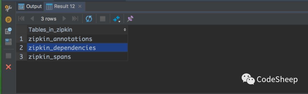 Sql脚本执行完成后,可以看到zipkin相关的三个表已经建成: