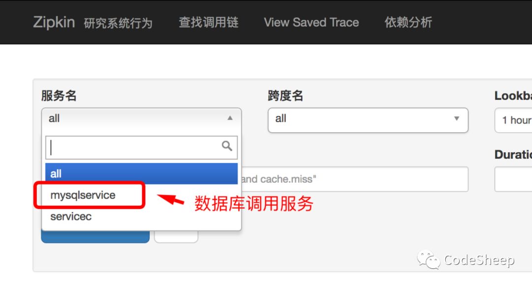 打开Zipkin Web UI,点击服务名下拉列表能看见已经成功识别了Mysql数据库调用服务