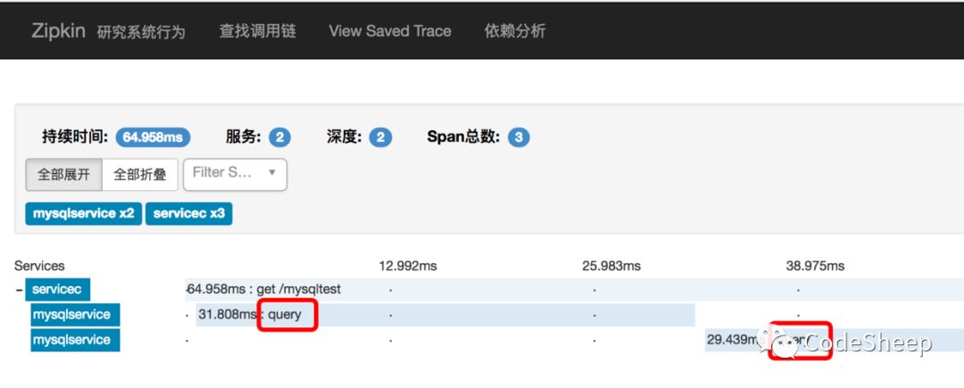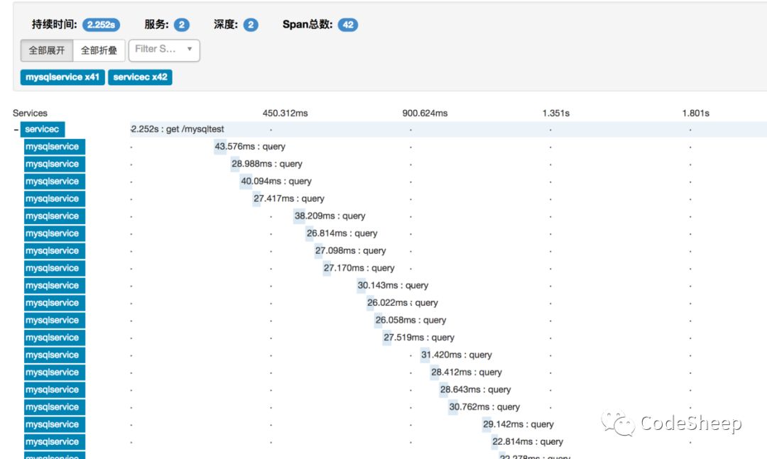 目的是再次触发Mysql的调用,然后再次Find Traces,可以看到追踪数据类似下图:包含两次Mysql的query动作: