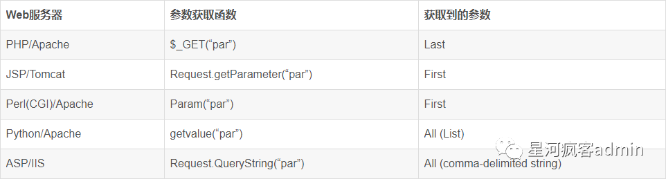 HPP又称做重复参数污染最简单的就是?uid=1&uid=2&uid=3对于这种情况不同的Web服务器处理方式如下