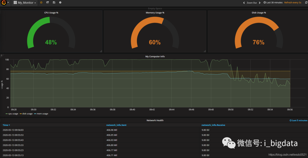 import _threadimport timeimport socketimport psutilfrom influxdb import InfluxDBClientclient=InfluxDBClient('localhost',8086,'u_wyk13195','p_wyk13195','my_monitor')#获取本机IPdef get_ip():s = socket.socket(socket.AF_INET, socket.SOCK_DGRAM)try:# doesn't even have to be reachables.connect(('10.255.255.255', 0))IP = s.getsockname()[0]except:IP = '127.0.0.1'finally:s.close()return IPip = get_ip()print(ip)#获取cpu信息def get_cpu(sec):while True:time.sleep(sec)info=psutil.cpu_percent(0)text=[{"measurement":"cpu_info","tags":{"host":ip},"fields":{"percent":info}}]client.write_points(text)def get_memory(sec):while True:time.sleep(sec)info=psutil.virtual_memory()text=[{"measurement":"memory_info","tags":{"host":ip},"fields":{"mem_percent":info.percent,"mem_used":info.used,"mem_free":info.free,}}]client.write_points(text)def get_disk(sec):while True:time.sleep(sec)info=psutil.disk_usage('/')text=[{"measurement":"disk_info","tags":{"host":ip},"fields":{"disk_used":info.used,"disk_free":info.free,"disk_percent":info.percent,}}]client.write_points(text)def get_network(sec):while True:time.sleep(sec)#print(psutil.net_io_counters(pernic=True))info = psutil.net_io_counters(pernic=True)['WLAN 3']text=[{"measurement":"network_info","tags":{"host":ip},"fields":{"bytes_sent":info.bytes_sent,"bytes_recv":info.bytes_recv,}}]client.write_points(text)try:_thread.start_new_thread( get_cpu,(10,))except:print("ERROR:cpu unable to start thread")try:_thread.start_new_thread( get_memory, (10,))except:print("ERROR:memory unable to start thread")try:_thread.start_new_thread( get_disk, (10,))except:print("ERROR:disk unable to start thread")try:_thread.start_new_thread( get_network,(10,))except:print("ERROR:net unable to start thread")while 1:pass