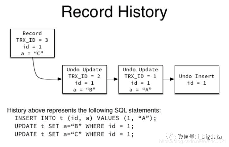 更新数据为{1,‘C’}时与更新{1,‘B’}相同,更新完成后此时undo log中有有两行记录({1,'B'}-->{1,'A'}),并且通过回滚指针连在一起。因此,如果undo log一直不清除,则会通过当前记录的回滚指针回溯到该行创建时的初始内容,所幸的时在Innodb中存在purge线程,它会查询那些比现在最老的活动事务还早的undo log,并删除它们,从而保证undo log文件不至于无限增长。