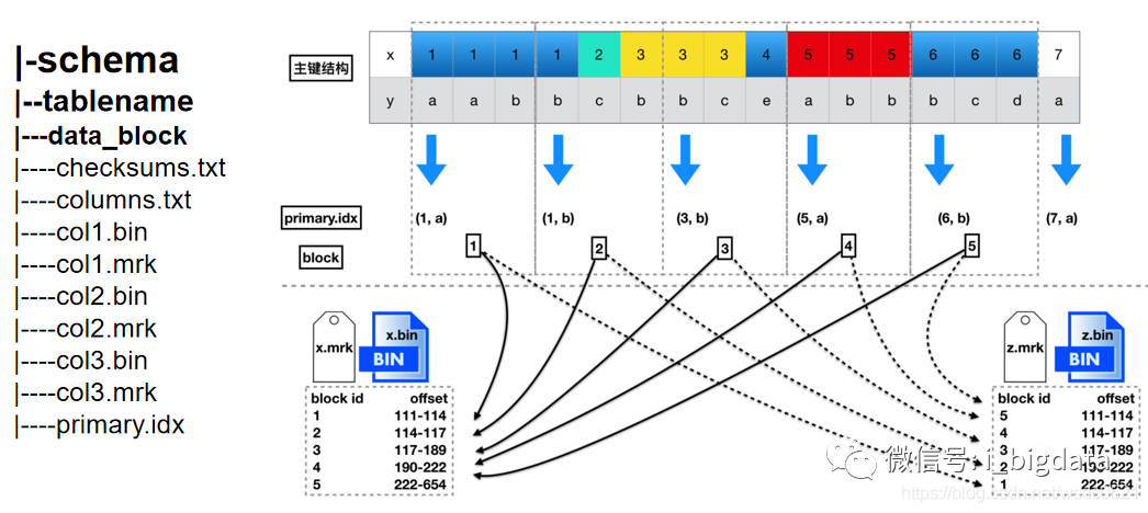 图上左边的结构图为/var/lib/clickhouse/data/default(schema)/(tablename)/.bin(列文件) .mrk(块偏移量) primary.idx主键索引