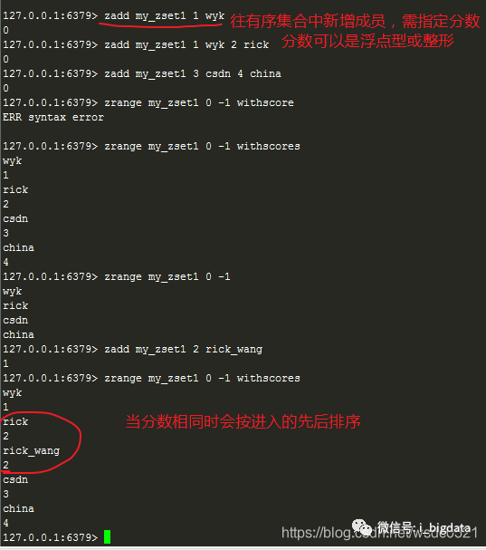 往有序集合中新增成员,需要指定该成员的分数,分数可以是整形或浮点型,当分数相同时候,索引下标按照字典排序:
