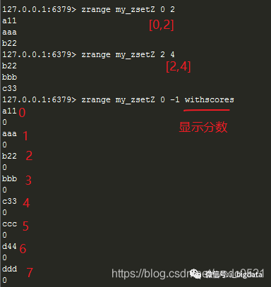 根据下标查看集合内所有成员(及分数),[start,stop]: