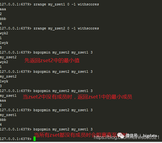 redis5版本之后的新功能。与bzpopmax相反。在参数中的所有有序集合均为空的情况下,阻塞连接。参数中包含多个有序集合时,按照参数中key的顺序,返回第一个非空key中分数最小的成员和对应的分数。参数 timeout