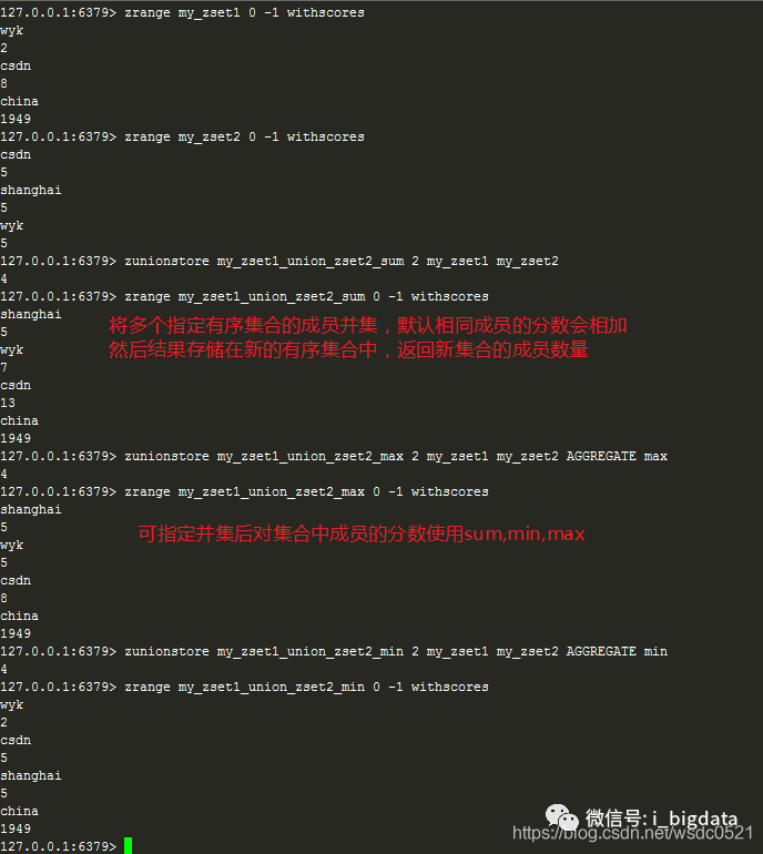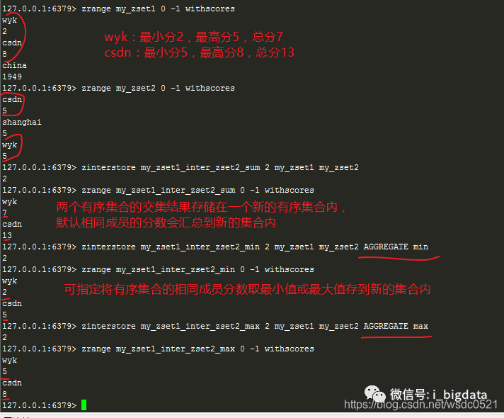 计算给定的一个或多个有序集的交集并将结果集存储在新的有序集合 key 中,给定 key 的数量必须以 numkeys 参数指定,并将该交集(结果集)储存到 destination ,默认情况下,结果集中某个成员的分数值是所有给定集下该成员分数值之和,可以使用aggregate参数指定将相同成员的分数取最小值或最大值: